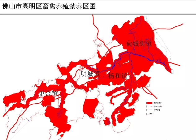 禁养区范围:荷城街道、西江新城全街道,杨和、明城、更合三镇人口集中区,主干河涌两边500米、主干河涌支流和其余河长制河涌两边200米范围,水源保护区,主干道路两旁100米范围,在本次划分中都被列入禁养区。
